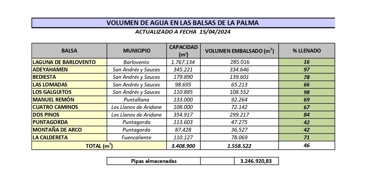 Volumen de agua en las balsas de La Palma (Actualizado el 15/04/2024)